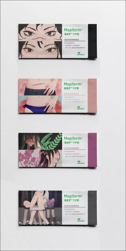 该设计作品把开盒过程模拟撕去疤痕、撕去疤痕贴的动作,将祛疤前后的图形产生直观对比,在开盒过程中传达给消费者“撕去伤疤,更好的你从这一刻开始”这一积极心理暗示,与产品功效定位贴合,给予消费者祛疤信心。